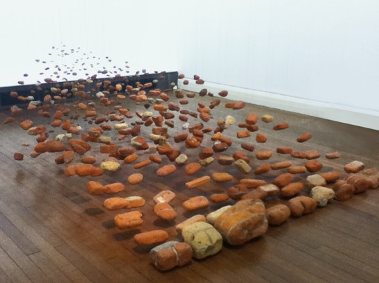 In the room as the viewer circles the piece air currrents and convection from heating cause the stones to move, yet they never seem to touch, even the smaller stones which have the greatest movment seem to avoid other stones close by. I like the sense of perspective by size of stone, I like the inclination I cant explain that these factors are simple pleasing to me.