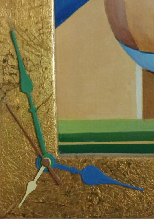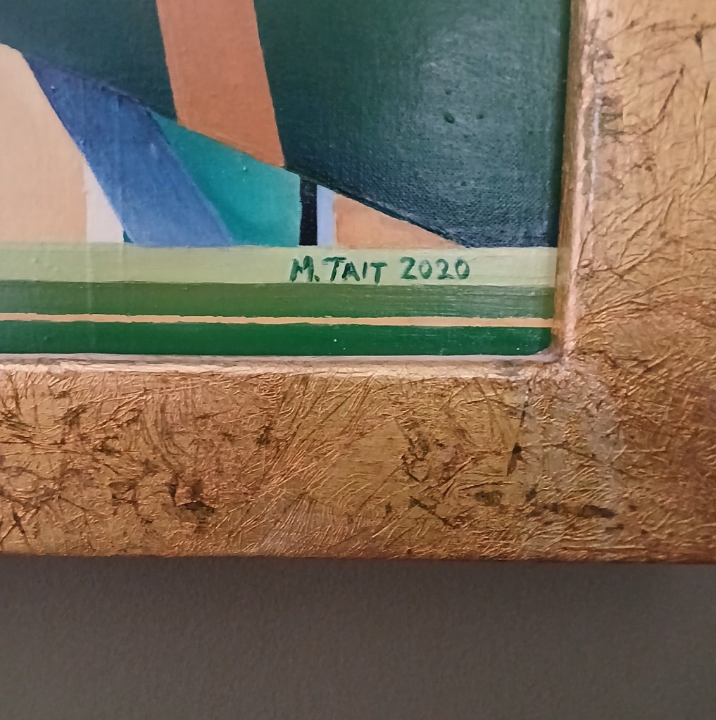 About the Work: The work is oil on canvas in a handmade frame with old pocket watch dials built into the top of the frame, the first of which I found on the beach nearby. Time is a human construct and has to pass for the “Fates” to act so the hands there are no hands the dials, there are four hands on the bottom left of the frame hinting at different timescales as to how and when things occur. In the painted image there are a few parts where the ribbons purposely do not follow the correct visual path and seem to go through what should be the solid vertical stripes of the background.