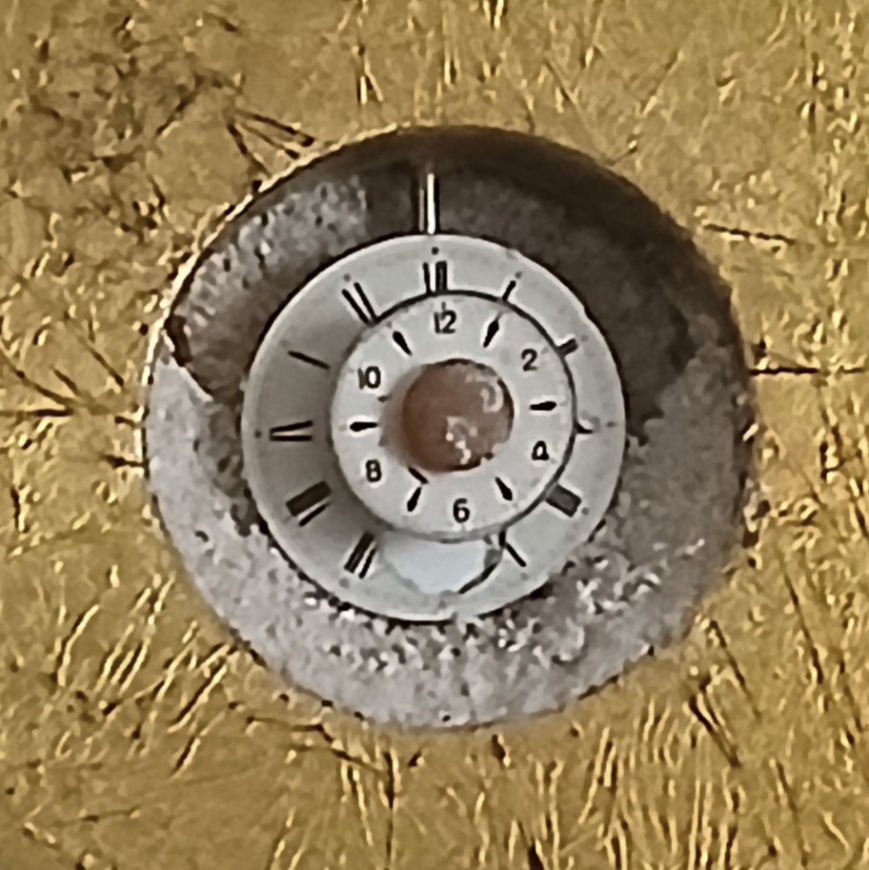 Oil on Canvas, with found watch dials and sand built into the frame, Image size: 49,5 x 39.5cms., Fame size: 69.5 x 51 x 5cms. Completed January 2020, inscribed bottom left, signed on the land the tangle eft side of the canvas on stretcher frame.