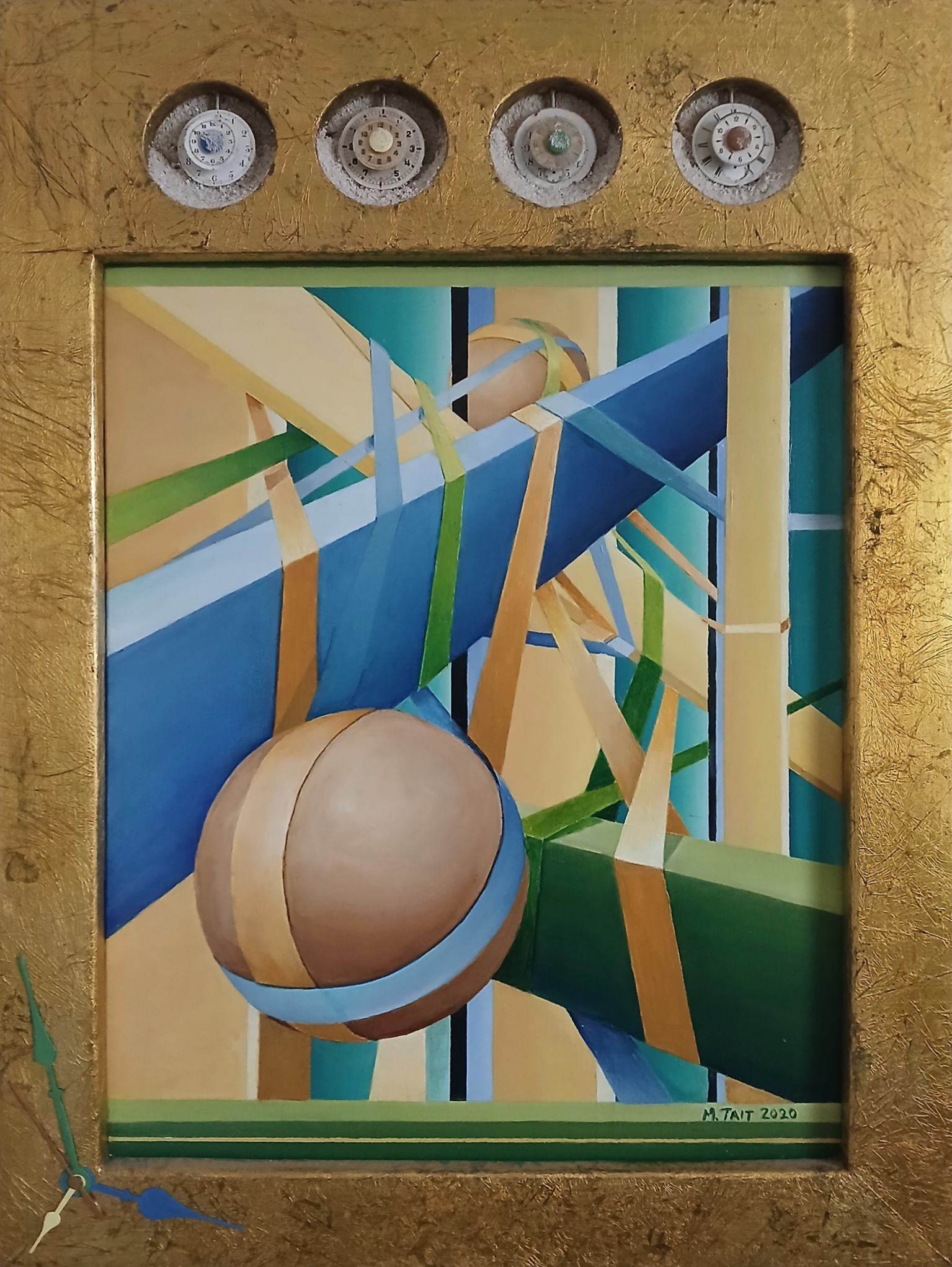 About the Work: The work is oil on canvas in a handmade frame with old pocket watch dials built into the top of the frame, the first of which I found on the beach nearby. Time is a human construct and has to pass for the “Fates” to act so the hands there are no hands the dials, there are four hands on the bottom left of the frame hinting at different timescales as to how and when things occur. In the painted image there are a few parts where the ribbons purposely do not follow the correct visual path and seem to go through what should be the solid vertical stripes of the background.
