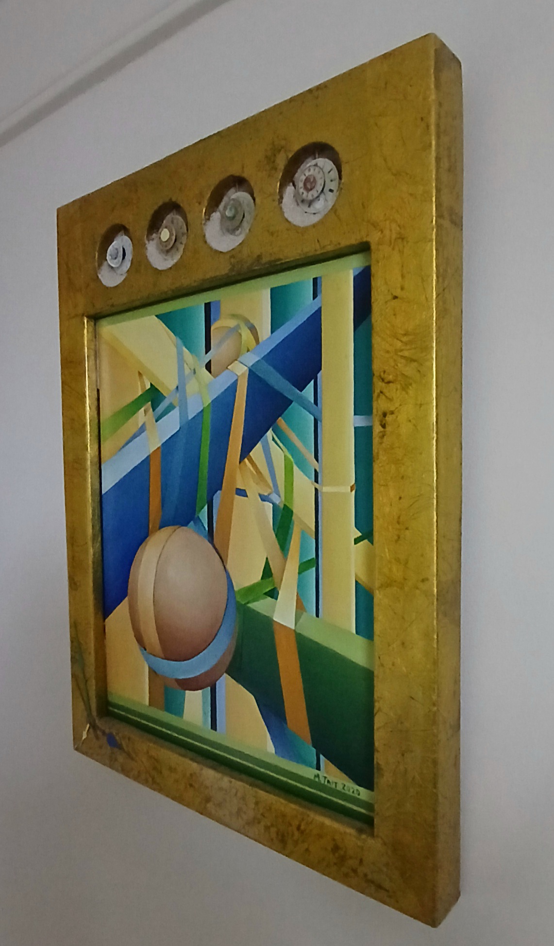 Oil on Canvas, with found watch dials and sand built into the frame, Image size: 49,5 x 39.5cms., Fame size: 69.5 x 51 x 5cms. Completed January 2020, inscribed bottom left, signed on the land the tangle eft side of the canvas on stretcher frame.