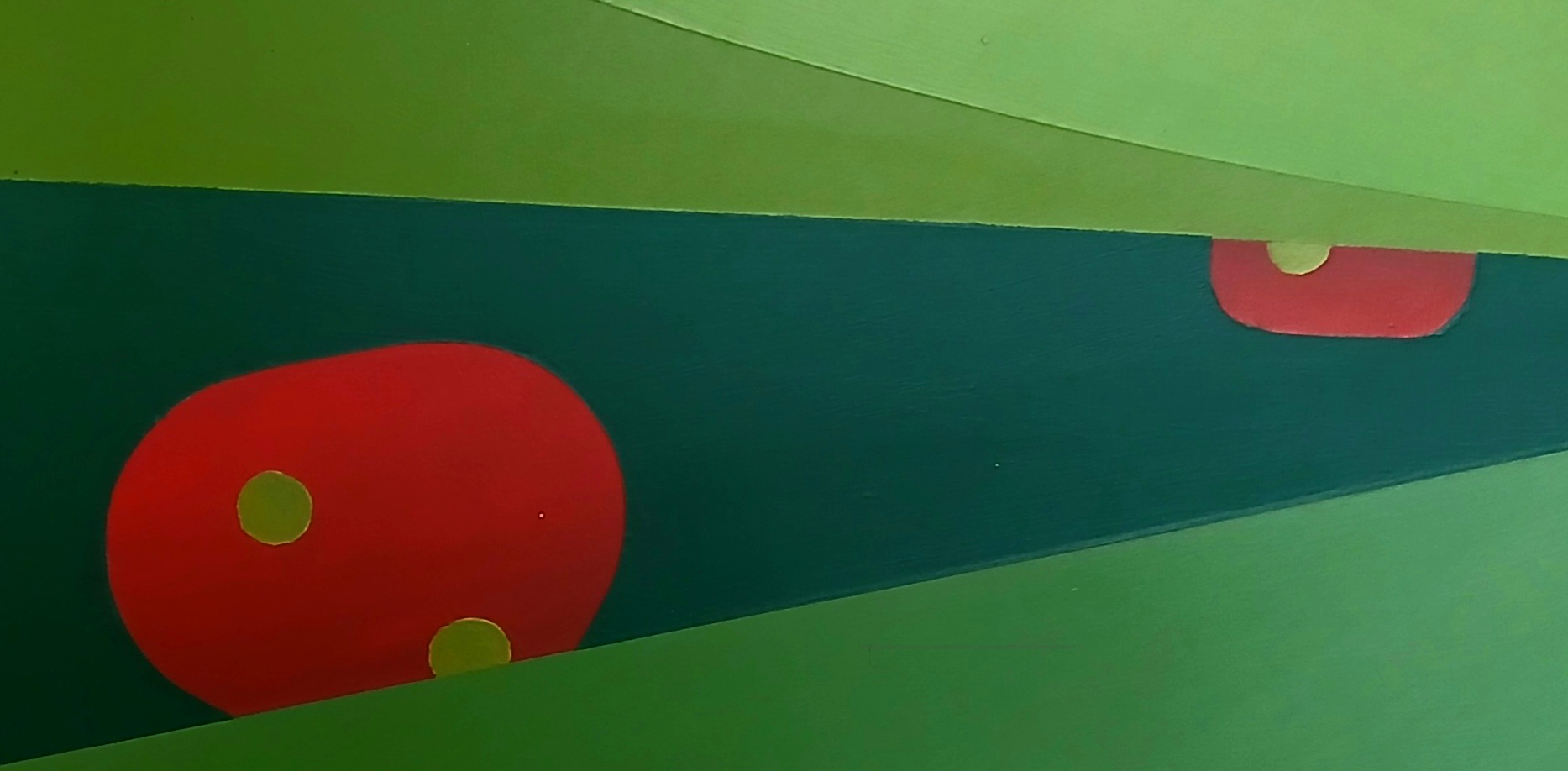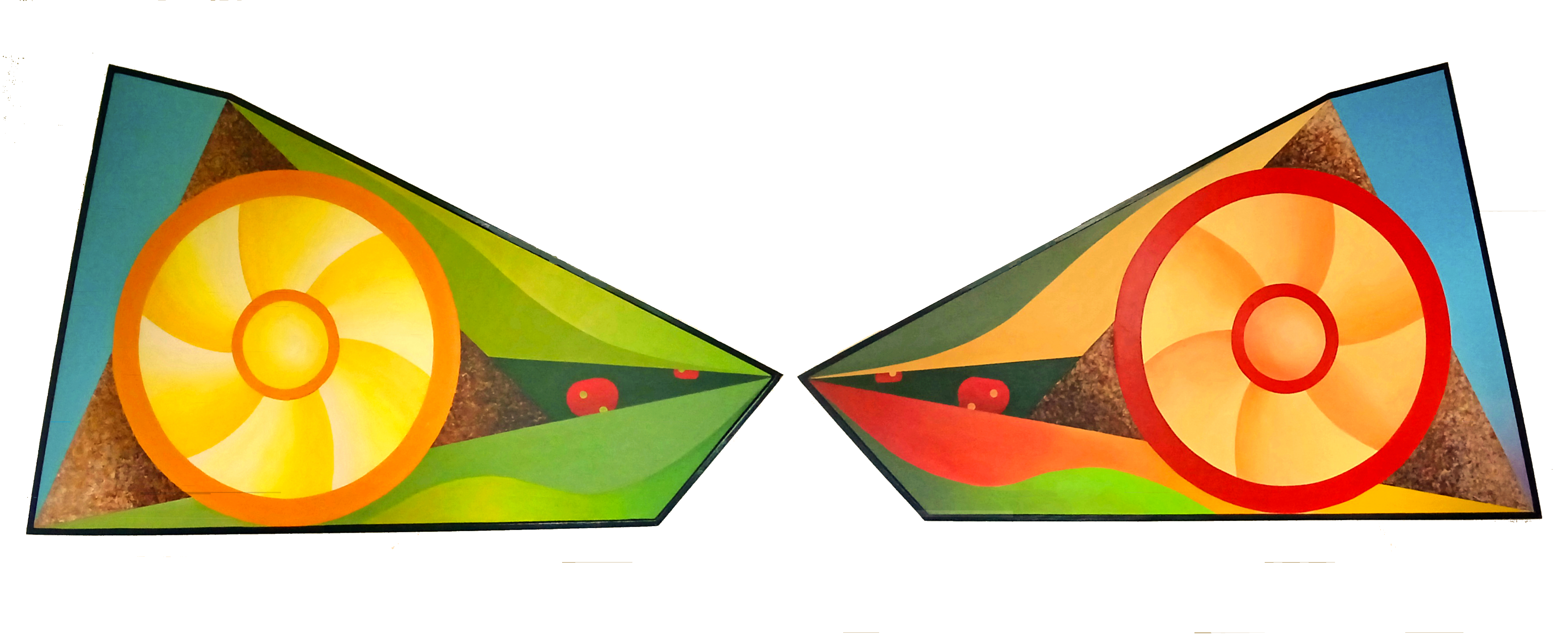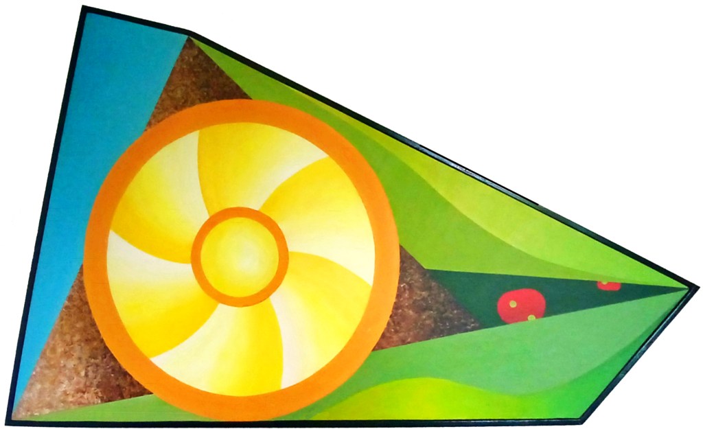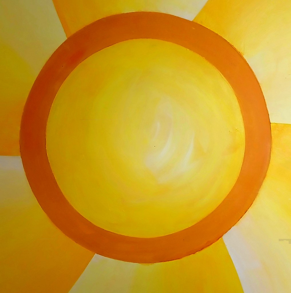 When I started making Spring at that time was looking at irregular canvas shapes and so eventually ended up with the shape you can see which I liked. The daffodil has six petals and looking into the flower was where the circular shape came from initially. Although the daffodil and ladybirds were the original inspiration, I did not want to reflect it realistically I wanted a shape with a more universal appeal. Humanity has been making circles since ancient times with it’s intonation of oneness and mystery.