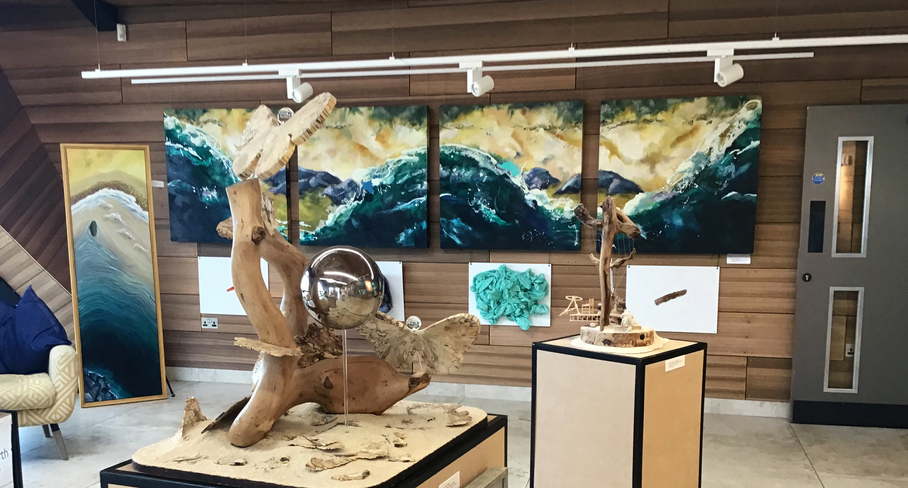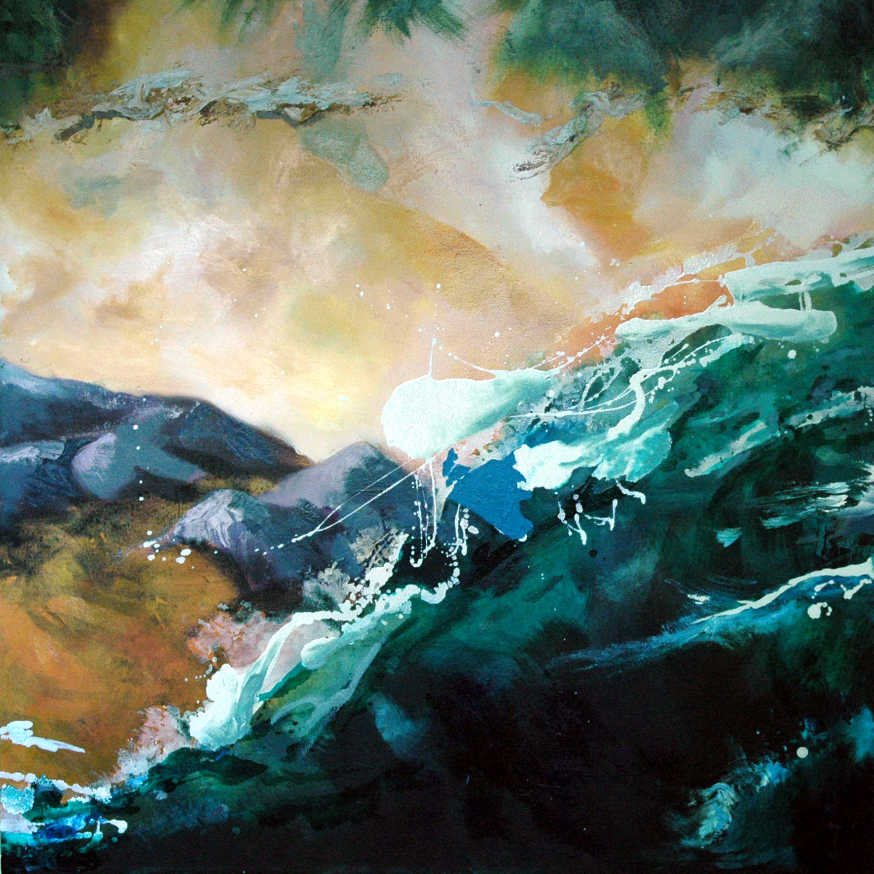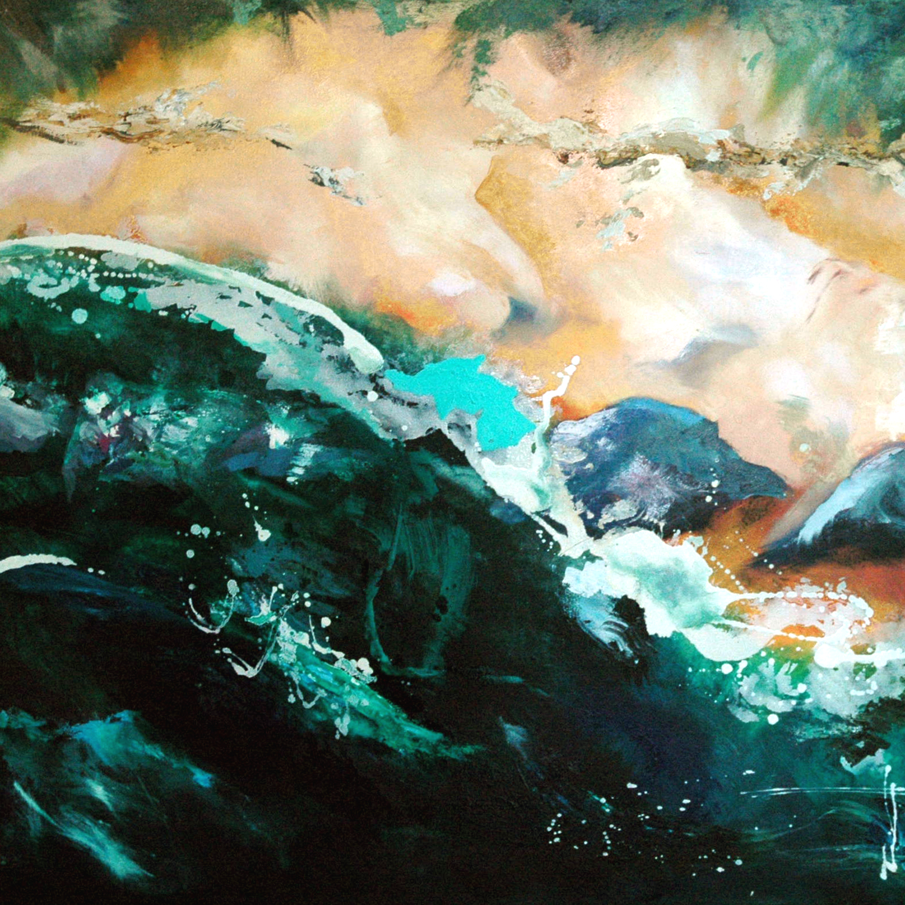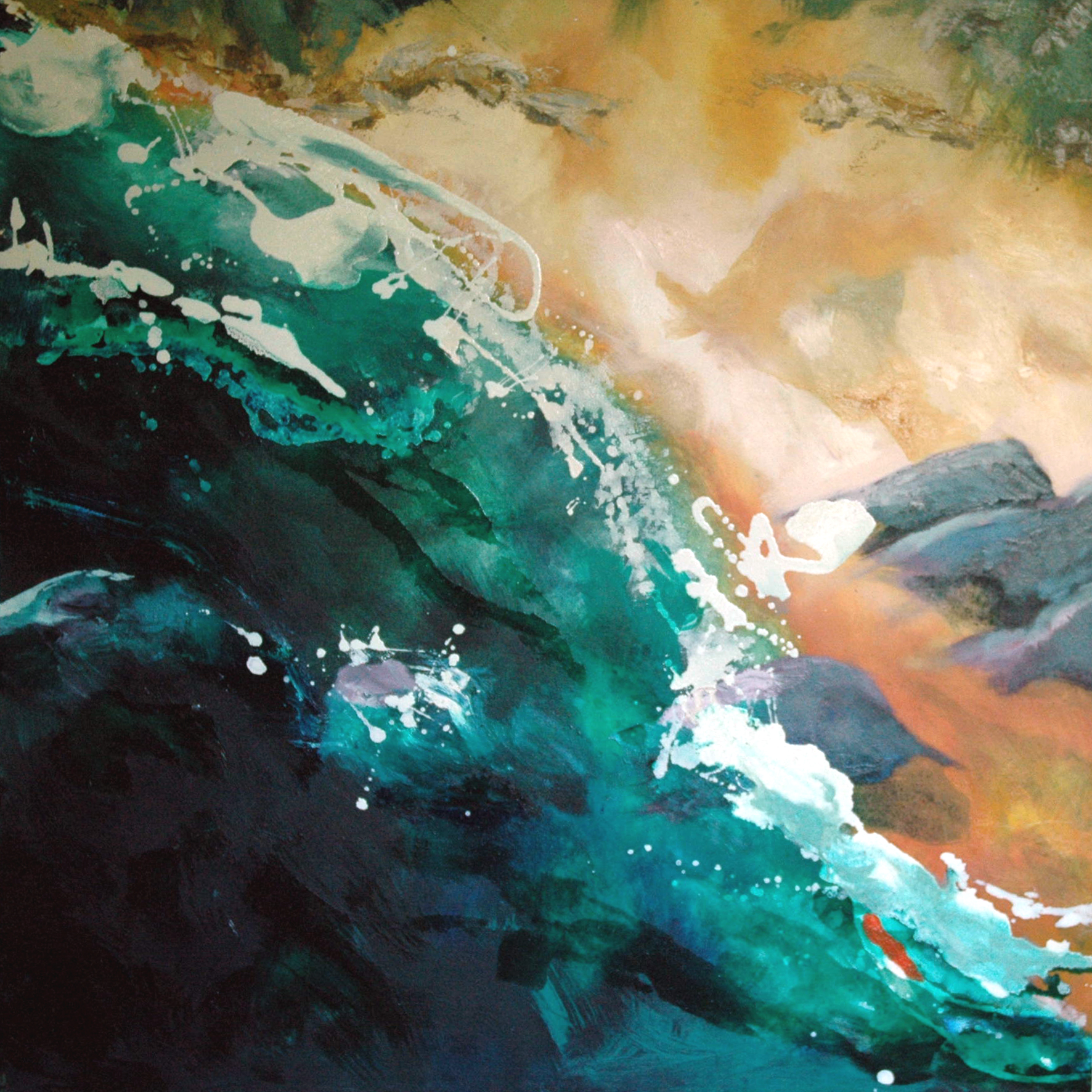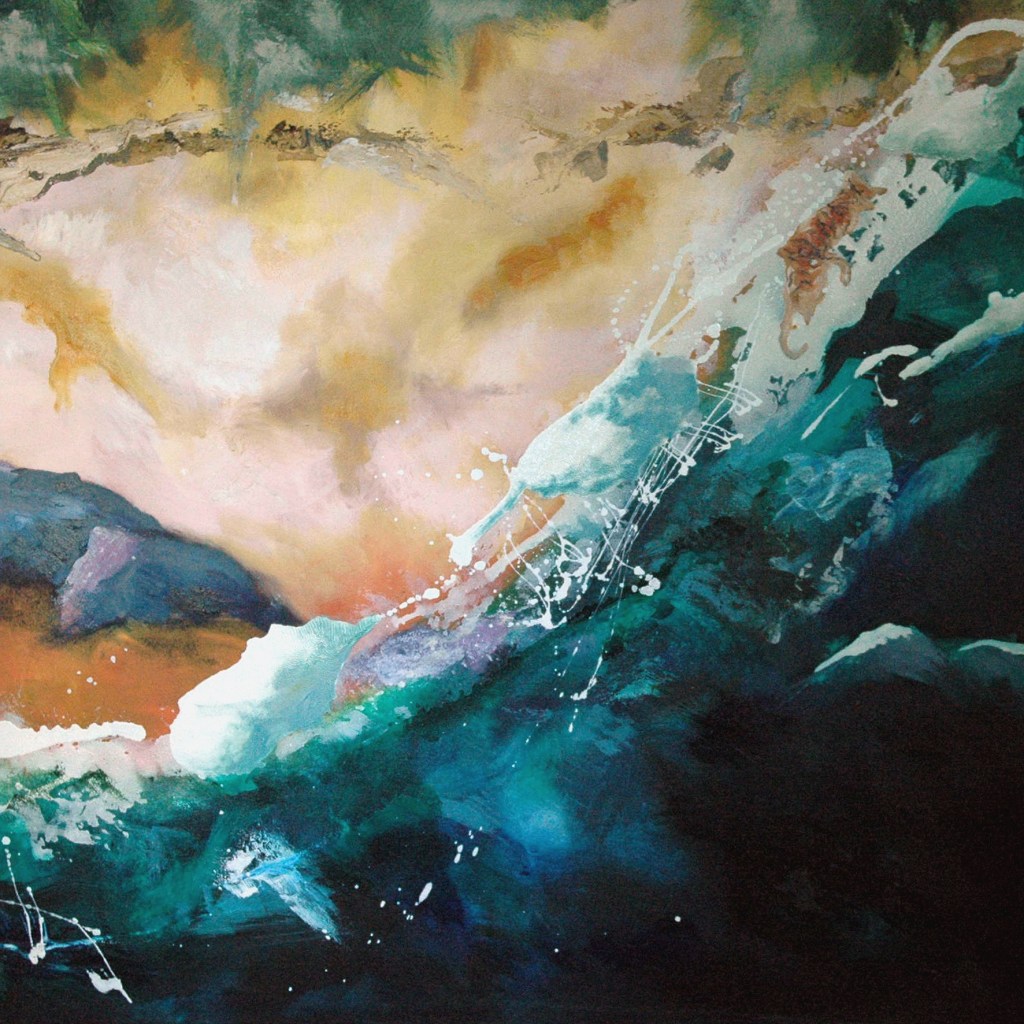 The Tidal Cycle and Artistic Interpretation: The shapes of the water’s edges in each of the four canvases are derived from a graph depicting an approximate 28-day repeating cycle of tidal variations. Tides ebb and flow twice daily; however, these cycles are slightly longer than a standard 24-hour period. This subtle difference means that tidal peaks and troughs occur a little later each day. Moreover, the height of each new tide is not consistent but varies depending on the alignment of the sun, the moon, and the earth. This pattern, repeating roughly every 28 days, is itself subject to minor variations with each cycle. It is important to note that this explanation is intentionally simplified and may contain inaccuracies, as it comes from the perspective of an artist rather than an oceanographer.